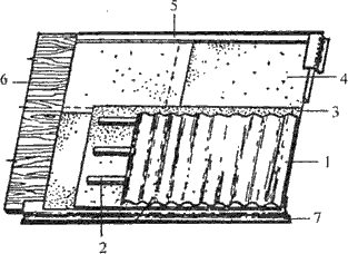 Рис. 38. Кровля из асбестоцементных листов (шифера): 1 – шифер; 2 – обрешетка; 3 – рубероид; 4 – пергамин; 5 – конек; 6 – сплошной настил из обрезной доски; 7 – отливы из оцинкованной стали.
