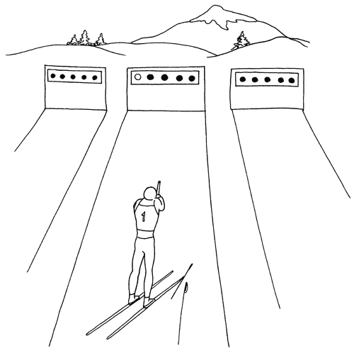Биатлон – это зимнее двоеборье. Оно состоит из двух составляющих: лыжных гонок и стрельбы на огневых рубежах. Стрельба ведется из малокалиберной винтовки. На дистанции для биатлона, длина которой равна 20 км, размещены 4 огневых рубежа. Все они находятся на дистанции между отрезками 3,5 и 17,5 км. Здесь участники соревнований делают по 5 выстрелов по мишеням с расстояния 50 м. При этом на первом и третьем рубежах нужно стрелять лежа, а на втором и четвертом – только стоя. В случае промаха участнику добавляется 1 мин штрафного времени (за каждый промах).
