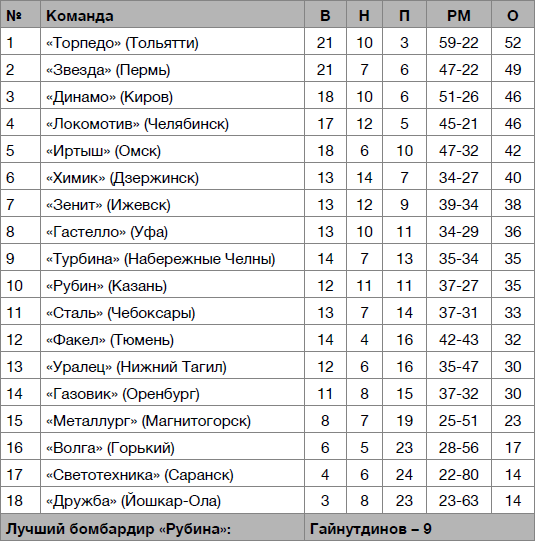 Ниже 19‑го места во второй лиге ни до 1979 года, ни после казанцы не опускались…Сказалась чехарда с составом, пополнявшие «Рубин» питомцы казанских клубов оказались не готовыми к конкуренции за место в основе, за редким исключением. Вот и пришлось казанцам ограничиться борьбой за выживание, в чем команда и преуспела, сохранив место во второй лиге.