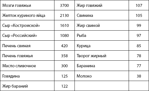 Рацион питания пожилых людей должен быть направлен против прогрессирования атеросклероза. Поэтому надо уменьшать потребление животных жиров, богатых насыщенными жирными кислотами, заменяя их растительными маслами (подсолнечным, оливковым, кукурузным, хлопковым и др.) в количестве 20–30 г в день. Эти масла не только хороши на вкус, но и способствуют нормализации холестеринового обмена благодаря наличию в них ненасыщенных жирных кислот. А вот употребление продуктов, содержащих много холестерина (печени, почек, мозгов, жирных сортов мяса, яичных желтков), следует ограничить. В этом вам помогут данные, приведенные ниже. Содержание холестерина в пищевых продуктах (в милиграммах на 100 г продукта)