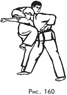 в) захват бьющей руки атакующего двумя руками с одновременным резким рывком на себя, удар правым коленом в корпус (рис. 160).