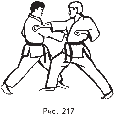 б) при атаке правой рукой в корпус защищающийся уходит с линии атаки шагом левой ногой вперед‑влево с одновременной защитой круговым ударом левым локтем (рис. 216);