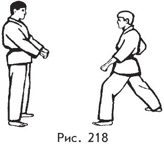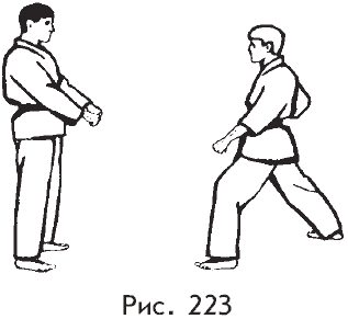 б) при атаке правой рукой в корпус защищающийся уходит с линии атаки шагом левой ногой вперед‑влево с одновременной защитой ударом ребром ладони обеих рук сверху (рис. 219, 220);