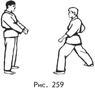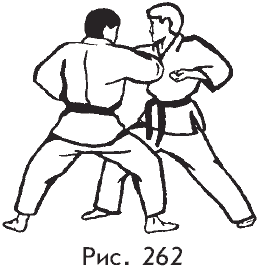 б) при атаке правой рукой в корпус уход с линии атаки шагом вперед‑влево левой ногой с одновременной встречной контратакой разноименным ударом правой руки в пах (рис. 260).