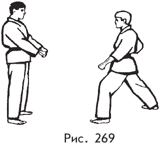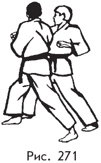 б) при атаке правой рукой в корпус выход левой ногой вперед‑вправо, разворачиваясь спиной к противнику (рис. 270);