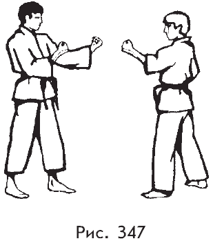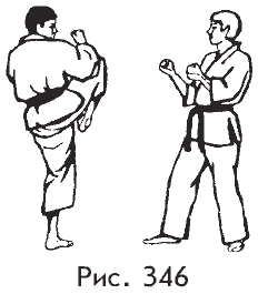 в) отпустив бьющую ногу противника, удар боковым или задним ударом правой ноги в голову или корпус в прыжке вперед‑вверх (рис. 345, 346).