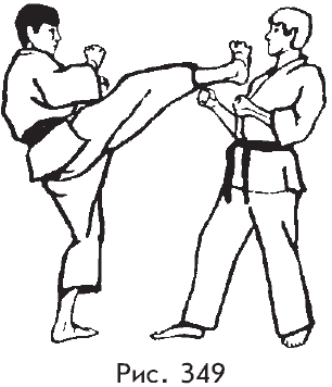 б) при атаке правой ногой в корпус защищающийся уходит с линии атаки, разворачиваясь на месте на 180 градусов вправо;с одновременной защитой предплечьем левой руки с последующей контратакой круговым маховым ударом внутренней частью стопы правой ноги в голову (рис. 348, 349);