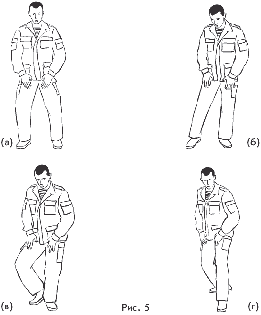 Перемещения в стойке в рукопашном бою применяются для защитно‑атакующих действий и маневра. Эти перемещения в зависимости от ситуации могут быть различными. Основные из них – это разворот или принятие положения тела под углом к атаке противника, шаг, подшаг, отшаг, шаг с подшагом, подскок, отскок, прыжок и другие. Рассмотрим один из основных способов перемещений – «шаг с подшагом». Для совершения «шага с подшагом» необходимо: – из базовой стойки или изготовки к бою (рис. 4) подставить одну из ног пяткой к пятке другой ноги и развернуться бедрами по направлению выбранного движения.