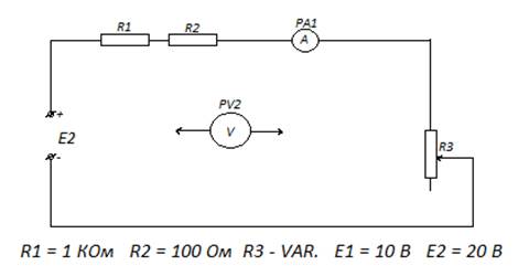 Часть 2б. Схема №3. 4.17. Изменить полярность источника Е1. 4.18. Собрать схему №3. Источники включены встречно. 4.19. Проверить правильность сборки. 4.20. Показать собранную схему преподавателю. Если есть ошибки в сборке схемы, устранить их. 4.21. Включить питание. 4.22. Измерить ток и напряжение для всех элементов схемы. 4.23. Результаты занести в таблицу №5. 4.24. Применить формулы энергетического баланса, рассчитать мощность источника и нагрузки для каждого положения ручки реостата, принять внутреннее сопротивление источника R0=0. 4.25. Данные расчетов занести в таблицу №6. 4.26. Привести пример расчета для одного положения ручки реостата. 4.27. Сделать выводы по всей работе. Схема №3 (Смена полярностей E1).
