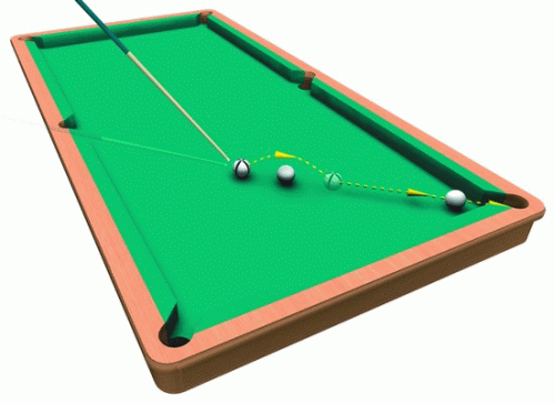 Если биток ударяют вправо вниз, то он закрутится справа налево, также пойдет по дуге и обойдет мешающий ему шар, но уже слева. Удар должен быть средней силы для того, чтобы «свой», обойдя шар, потерял бы инерцию, полученную от прямолинейного толчка, и покатился в сторону играемого шара. Кривизна же траектории дуги, по которой пойдет биток, зависит от степени преобладания тангенциальной силы над силой центральной.