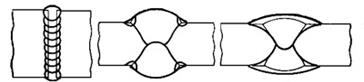 С целью повышения выносливости при действии динамических нагрузок для некоторых соединений из стали и титановых сплавов плавность сопряжения металла шва с основным металлом достигается за счет оплавления мест перехода теплотой дуги, горящей между неплавящимся электродом и основным металлом, как с присадкой, так и без присадочного материала. В результате образуются галтельные валики, улучшающие внешнюю форму шва (рис. 2.9, б). Для получения равнопрочного соединения при сварке высокопрочной стали и некоторых сплавов цветных металлов приходится дополнительно наплавлять металл и увеличивать внешнюю часть швов (рис. 2.9, в). Качество сварных соединений и экономичность процесса сварки зависят от чистоты кромок и прилегающей к ним поверхности основного металла, точности подготовки и сборки под сварку.