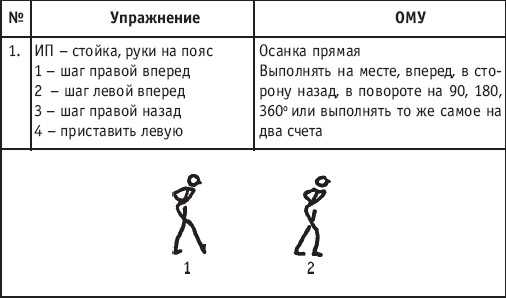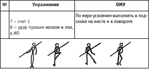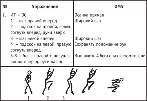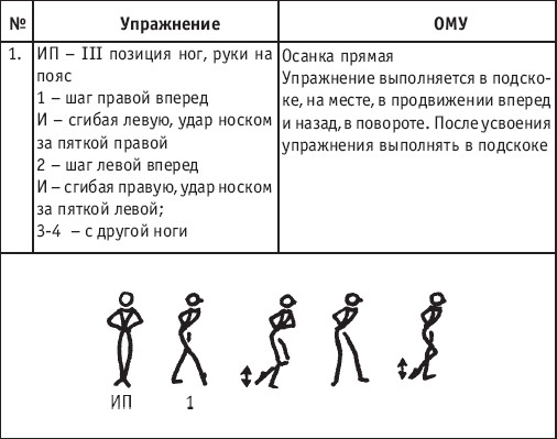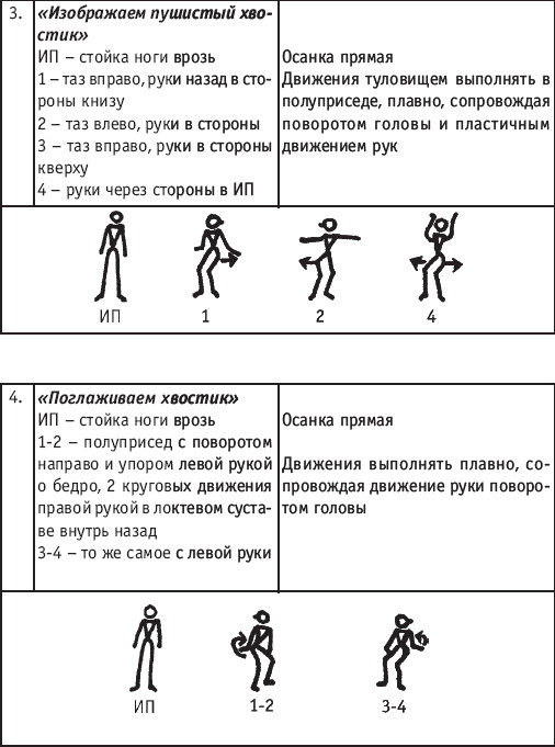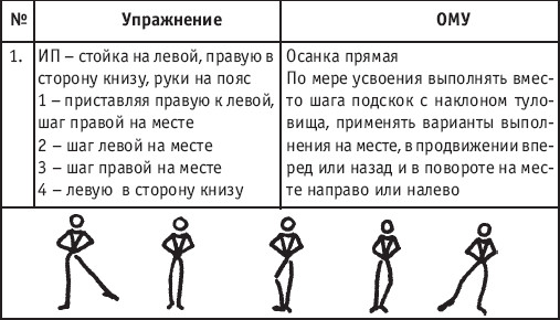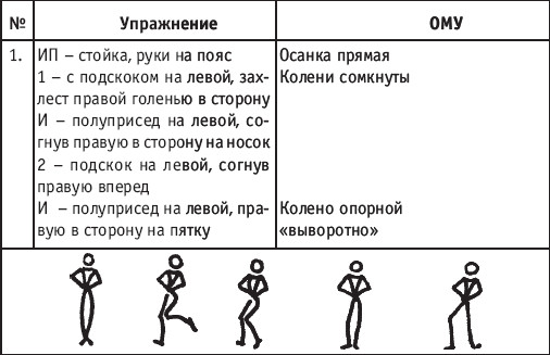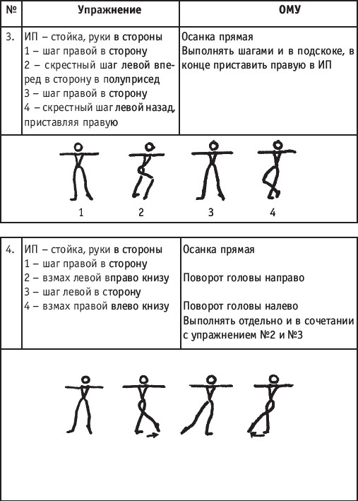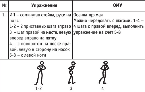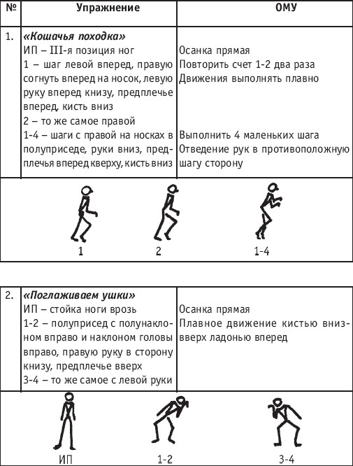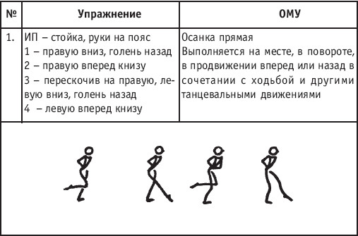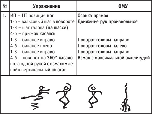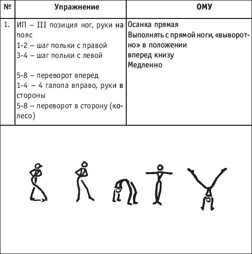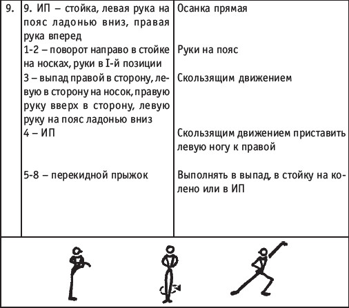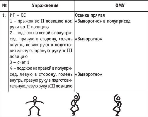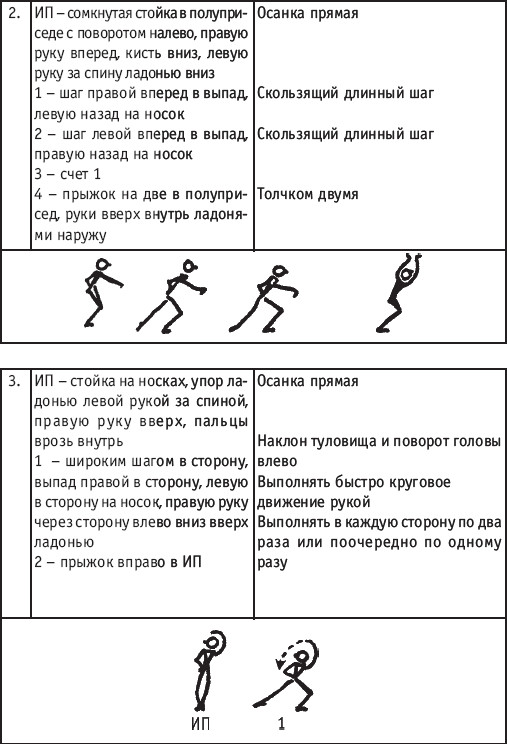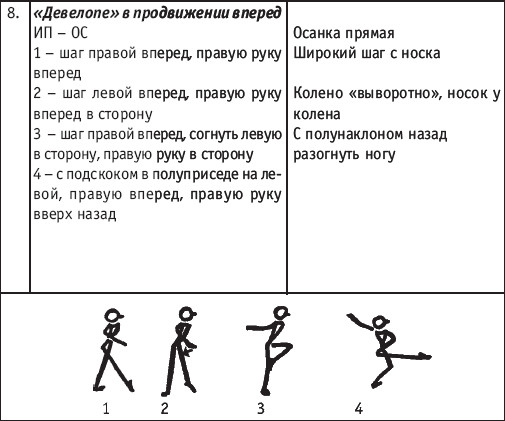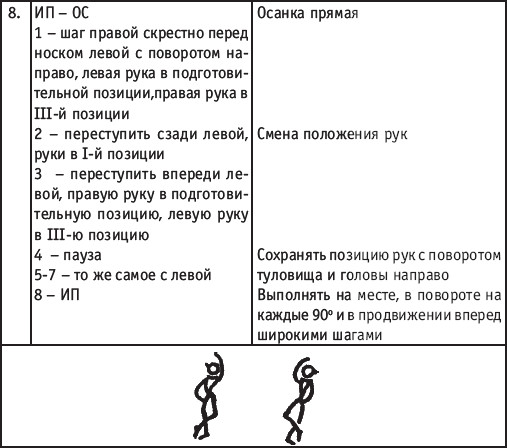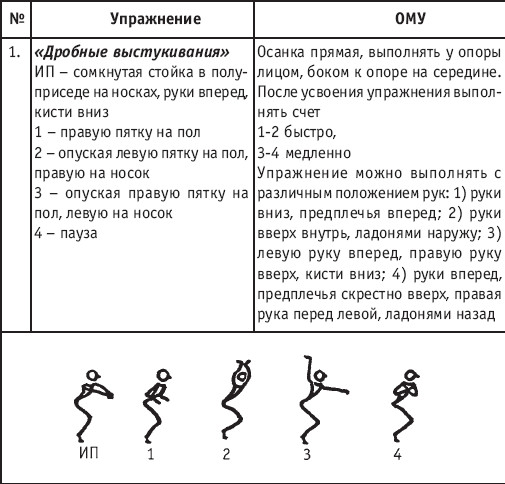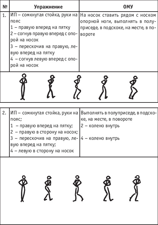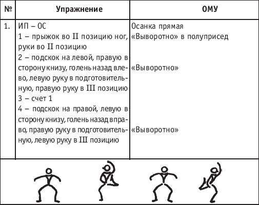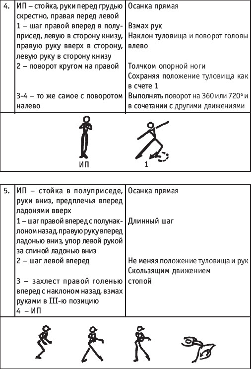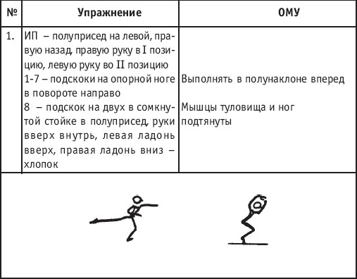 Движение сопровождается поворотом головы. При отведении правой руки из I-й позиции во II-ю голова одновременно поворачивается в том же направлении. При опускании левой руки из III-й позиции в I-ю взгляд направлен на кисть этой же руки. Правая из demi-plie скользящим движением отводится во II-ю позицию. После этого выполняется pas degage через проходящее demi-plie. Левая отводится в сторону на носок и закрывается в V-ю позицию вперед в demi-plie с одновременным поворотом направо. При отведении правой в сторону, левая рука переходит из I-й позиции во II-ю. При выполнении pas degage руки сохраняют II-ю позицию и опускаются в подготовительное положение с одновременным приставлением левой в V-ю позицию. Центр тяжести туловища во время выполнения pas degage перенести с левой ноги на правую. Поворот головы при отведении левой руки из I-й позиции во II-ю выполняется в том же направлении. На завершающем demi-plie она сохраняет это же положение. После этого все упражнение повторяется с другой ноги. Temps lie par terre назад выполняется по той же схеме, но сначала pas degage выполняется назад, затем отводится в сторону на носок нога, стоящая сзади в V-й позиции. Изучать это упражнение рекомендуется медленно, разложив выполнение на два музыкальных такта в 4/4. На 1/4 выполняется demi-plie, на 1/4 отводится нога, на 1/4 выполняется pas degage, на 1/4 фиксируется поза и т. д. Основная задача этого упражнения – развитие плавной, слитной и мягко протекающей связи всех элементов, из которых оно слагается. В дальнейшем temps lie можно выполнять на два музыкальных такта в 3/4, то есть фиксировать каждую позу на первую долю музыкального такта. При выполнении необходимо отрабатывать непрерывную слитность demi-plie, pas degage и фиксацию позы. Совершенствование элементов экзерсиса на середине Адажио – совершенствование поз: тербушон, аттетюд, равновесий, пор де бра. Малая аллегро группа прыжков – совершенствование соте, эшап-пе, изучение жете, ассамбле, сиссон симпл. Средняя группа прыжков Изучение: па де ша, сиссон ферме в первой половине года, фаи, сиссон фуэте, сот баск, револьтад на 45°, кабриоль на 45°. Совершенствование прыжков: со сменой положения ног впереди, сиссон ферме с элементами ИВС (переворот вперед, в сторону, назад, стойка на руках и т. д.). Большая группа прыжков Совершенствование: гранд жете, шагом касаясь, сгибая и разгибая ногу. Изучение энтрелесе – перекидной с остановкой в выпад. Урок хореографии в многолетней подготовке спортсменов 104 РЕКОМЕНДУЕМЫЕ ХОРЕОГРАФИЧЕСКИЕ ДВИЖЕНИЯ ДЛЯ УЧЕБНО-ТРЕНИРОВОЧНОЙ ГРУППЫ ПЕРВОГО ГОДА ОБУЧЕНИЯ ПОЛЬКА (М/Р 2/4) В продвижении вперед, назад и в повороте на месте и в повороте на 180° в продвижении и с элементами ИВС. Задача: научить выполнять элементы слитно и выразительно. Пример соединения «ФЛИК-ФЛЯК» В ЦЫГАНСКОМ СТИЛЕ «МОЛОТОЧКИ» – РУССКИЙ СТИЛЬ «КОВЫРЯЛОЧКА» – В ТАТАРСКОМ СТИЛЕ (М/Р – 2/4, 4/4) «ГАРМОШКА» – В ТАТАРСКОМ СТИЛЕ «КОВЫРЯЛОЧКА» – В КАВКАЗСКОМ СТИЛЕ «КОВЫРЯЛОЧКА» – В РУССКОМ СТИЛЕ ТАНЦЕВАЛЬНЫЕ ДВИЖЕНИЯ В МОЛДАВСКОМ СТИЛЕ
