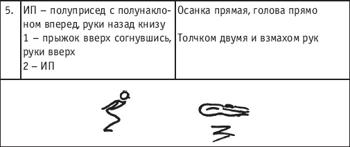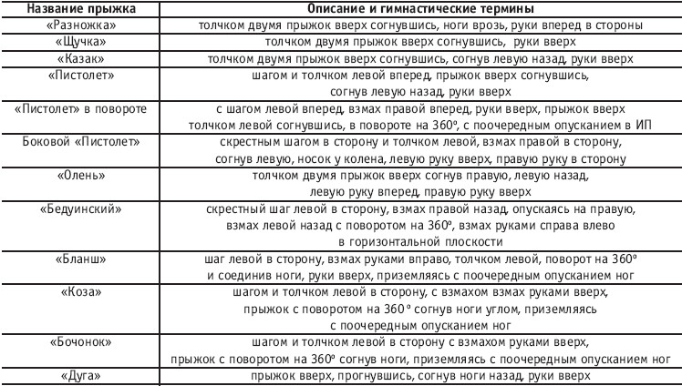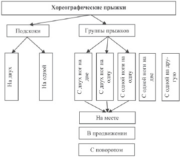 Все хореографические прыжки можно подразделить на определенные группы в зависимости от амплитуды, выполнения на месте, в продвижении, в повороте, прыжки с двух ног на две, с двух ног на одну, с одной ноги на одну. Некоторые прыжки, относящиеся к определенной группе, могут выполняться как с малой, так и с большой амплитудой. Например, эшапе, револьтад, кабриоль, па де ша и т. д. Прыжки классического танца подразделяются на пять групп. На схеме показаны основные виды прыжков. Простейшие из них – подскоки, для которых характерна малая высота выполнения и небольшая амплитуда движений. Содержат в себе общие структурно-технические элементы, позволяющие выделить несколько характерных стадий: подготовительную, основную, стадию реализации, завершающую стадию. Подготовительная стадия, которая состоит из трех фаз: 1-я – разбег, 2-я – наскок с замахом ноги или с места – замах, 3-я – амортизация, в прыжках с места – полуприсед, в котором частично гасится ранее полученное движение за счет напряженного опускания с носка на всю стопу и сгибания ног в коленном и тазобедренном суставах. Основная стадия: 4– ая фаза – отталкивание 5– ая фаза – отрыв от опоры Стадия реализации: 6– ая фаза – формообразующее действие 7– ая фаза – фиксация позы Завершающая стадия: 8– ая фаза – подготовка к приземлению 9– ая фаза – амортизация 10– ая фаза – связующая и корректирующая действия ГРУППЫ ХОРЕОГРАФИЧЕСКИХ ПРЫЖКОВ И ИХ ПРИМЕНЕНИЕ В СООТВЕТСТВИИ С СОВРЕМЕННЫМИ ТРЕБОВАНИЯМИ КЛАССИФИКАЦИОННЫХ ПРОГРАММ Особенность прыжков заключается в том, что спортсмены должны не только прыгнуть как можно выше, но и выполнить движение с предельной амплитудой, легкостью и грацией, отобразив эмоциональный характер музыкального сопровождения. Только при таком выполнении прыжок станет не просто технически сложным упражнением, но и выразительным средством в вольных упражнениях. В тексте дается описание профилирующих прыжков, которые объединяются между собой приемами толчка и приземления. Прыжки с двух ног на две Прыжки по I-й, 11-й, Ш-й позициям. Прыжки должны выполняться легко, пружинно, с сохранением исходной позиции ног, в выворотном положении. В полете ноги выпрямлены, носки чуть оттянуты, осанка прямая (не прогибаясь и не сгибаясь в тазобедренных суставах). Мышцы спины подтянуты. Прыжки со сменой позиций ног. При выполнении данных прыжков положение ног фиксируется в исходной позиции, и лишь при приземлении ноги возвращаются в другую позицию (например, прыжки из I-й позиции в I-ю. В полетной фазе ноги фиксируются в и.п. и при приземлении соединяются вместе в I позицию). Прыжки, сгибая ноги вперед. Возможно выполнение данных прыжков без наклона, с наклоном вперед, сгибая ноги вместе, одну выше другой. Выполняются на месте, с дополнительного наскока (небольшим махом одной и толчком другой прыжок на две). Прыжки, сгибая ноги назад. Возможно выполнение с различным углом сгибания ног, с прямой осанкой, прогнувшись, «кольцом» двумя. Толчком двумя прыжок касаясь. В полете одна нога отводится назад, другая сгибается. Осанка прямо, лопатки соединены, руки в стороны. Разновидности прыжка касаясь: касаясь «кольцом», касаясь с поворотом на 90, 180, 360°. Прыжок ноги врозь. В полете ноги разводятся точно врозь, мышцы спины подтянуты, руки в стороны, вверх, в стороны кверху. Возможно выполнение прыжка,