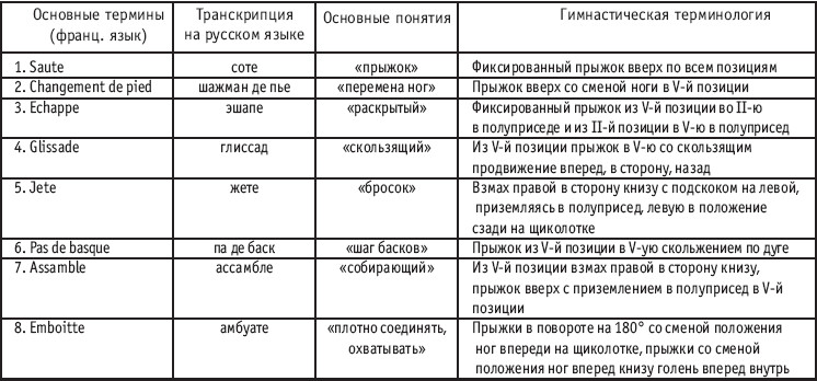 CHANGEMENT DE PIED (ШАЖМАН?? ПЬЕ) ПРЫЖОК С ДВУХ НОГ НА ДВЕ СО СМЕНОЙ ПОЛОЖЕНИЯ НОГ В V-Й ПОЗИЦИИ Подводящие упражнения к выполнению данного прыжка применять аналогично saute (соте). ECHAPPE (ЭШАПЕ) ПРЫЖОК С ДВУХ НОГ НА ДВЕ ИЗ V-Й ПОЗИЦИИ ВО II-Ю И ОБРАТНО Подводящие упражнения: ИП – V-я позиция ног GLISSADE (ГЛИССАД) ПРЫЖОК С ДВУХ НОГ НА ДВЕ (СКОЛЬЖЕНИЕМ, ПРОДВИЖЕНИЕМ ВПЕРЕД, В СТОРОНУ, НАЗАД) ИЗ V-Й ПОЗИЦИИ В V-Ю И ОБРАТНО Подводящие упражнения: ИП – V-я позиция ног PAS JETE (ПА ЖЕТЕ) ПРЫЖОК ВВЕРХ С ОДНОЙ НОГИ НА ОДНУ В ПОЛОЖЕНИЕ SUR LE COU DE PIED ВЫПОЛНЯЕТСЯ НА МЕСТЕ, С ПРОДВИЖЕНИЕМ ВПЕРЕД ИЛИ НАЗАД PAS DE BASQUE (ПА ДЕ БАСК) ПРЫЖОК С ДВУХ НОГ НА ДВЕ ИЗ V-Й ПОЗИЦИИ НОГ В V-Ю. ВЫПОЛНЯЕТСЯ ВПЕРЕД И ПО ДУГЕ ВПРАВО И ВЛЕВО