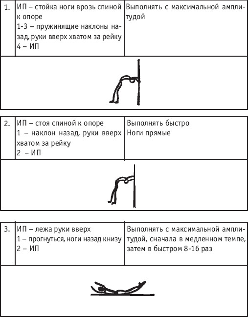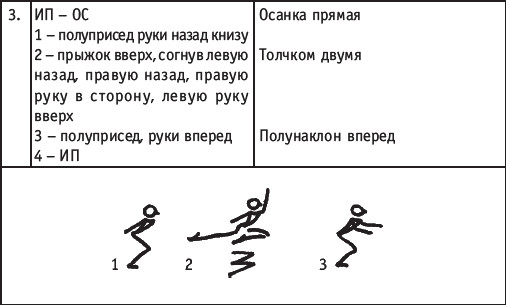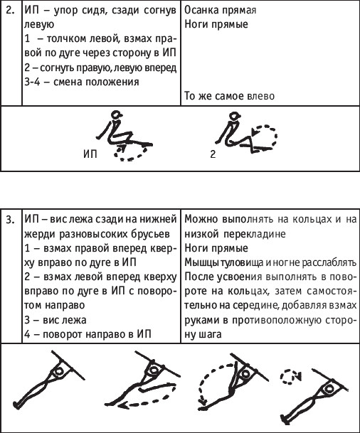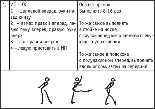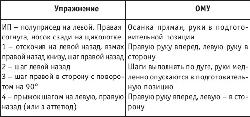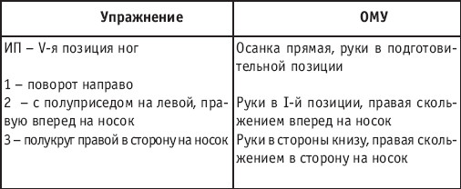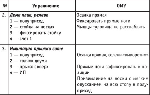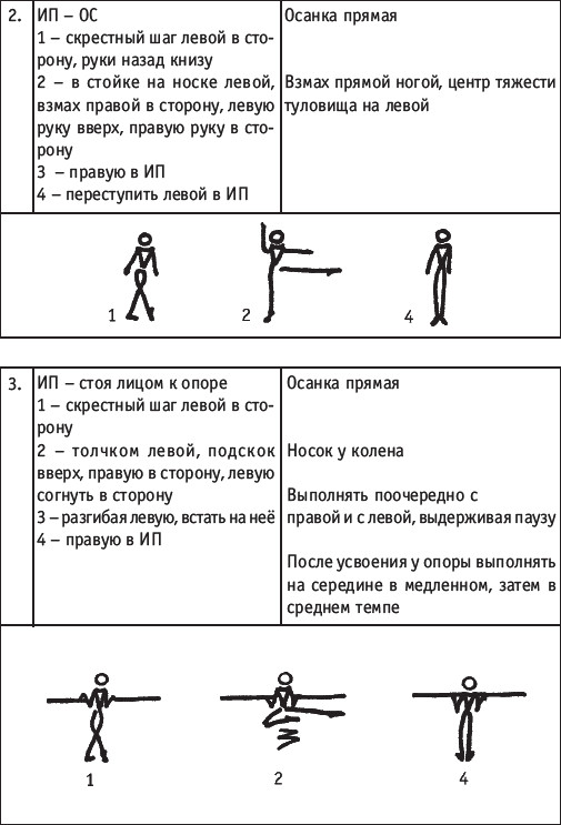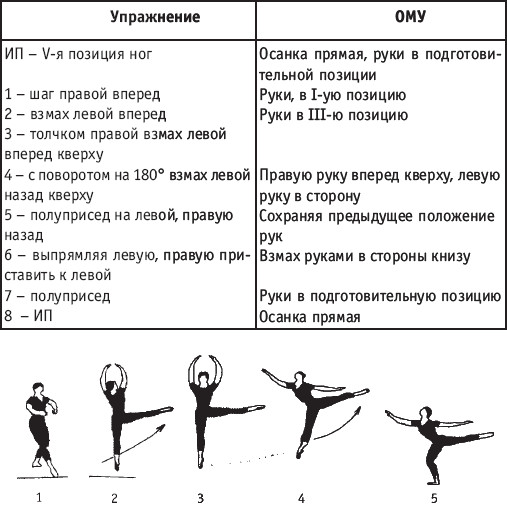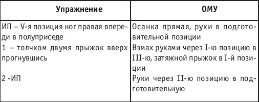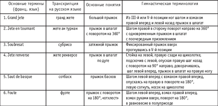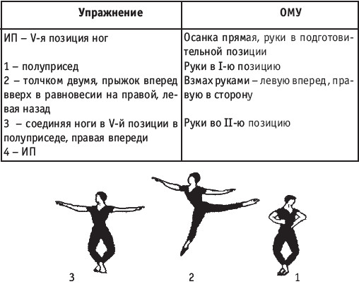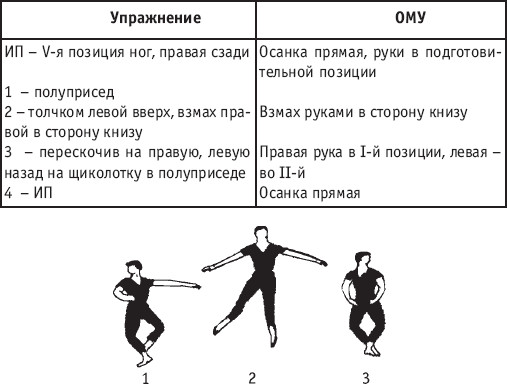 Обучение проводится боком к опоре, по мере усвоения выполняется на середине в сочетании с другими прыжками и элементами экзерсиса. SOUBRESAT (СУБРИСО) ПРЫЖОК ИЗ V-Й В V-Ю С ДВУХ НОГ НА ДВЕ ASSAMBLE (АССАМБЛЕ) ПРЫЖОК ИЗ V-Й В V-Ю ПОЗИЦИЮ С ДВУХ НОГ НА ДВЕ Разучивается лицом к опоре, сначала выполняя схему прыжка без подскока, затем сам прыжок. После освоения выполняется на середине отдельно и в сочетании с другими прыжками. СРЕДНЯЯ ГРУППА ПРЫЖКОВ SISSONNE FERME (СИССОН ФЕРМЕ) ПРЫЖОК ИЗ V-Й ПОЗИЦИИ НОГ В V-Ю, С ДВУХ НОГ НА ДВЕ В ПРОДВИЖЕНИИ ВПЕРЕД, В СТОРОНУ, НАЗАД Аналогично выполняется в любом из трех направлений. Разучивается боком у опоры, в сочетании с grand battement (гранд батман) на середине с элементами экзерсиса и элементами ИВС. SISSONNE TOMBE (СИССОН ТОМБЕ) ПРЫЖОК С ДВУХ НОГ НА ОДНУ ИЗ V-Й ПОЗИЦИИ НОГ В ВЫПАД ПО ТРЕМ НАПРАВЛЕНИЯМ – ВПЕРЕД, В СТОРОНУ, НАЗАД Разучивается боком у опоры с элементами экзерсиса и элементами ИВС, по мере освоения выполняется на середине. В процессе совершенствования прыжка выполняется в повороте на 180 и 360°. SISSONNE OUVERTE (СИССОН УВЕР) ПРЫЖОК С ДВУХ НОГ НА ДВЕ С ВЫПОЛНЕНИЕМ ПО ТРЕМ НАПРАВЛЕНИЯМ ВПЕРЕД, В СТОРОНУ, НАЗАД И EN TOURNANT (АН ТУРПАН) В ПОВОРОТЕ НА 180 И 360 ° Разучивание боком и лицом к опоре, применяя освоенные ранее элементы passe (пассе), developpe (девелопе) и прыжок soute (соте) и assamble (ассамбле) в сочетании с элементами экзерсиса и элементами ИВС, по мере усвоения выполняется на середине. БОЛЬШАЯ ГРУППА ПРЫЖКОВ SISSON NE OUTER (СИССОН ФУЭТЭ) ПРЫЖОК С ОДНОЙ НОГИ НА ОДНУ С ПОВОРОТОМ НА 180» Разучивается боком у опоры в сочетании с батман жете, гранд батман жете и в соединении с элементами ИВС. По мере усвоения выполняется с поддержкой партнера, затем самостоятельно, на середине с левой или с правой ноги, поочередно или в соединении с pas chasse (па шассе или шагом галопа). ENTRELESE (ЕНТРЕЛЕСЕ – «ПЕРЕКИДНОЙ») ПРЫЖОК С ОДНОЙ НОГИ НА ОДНУ С ПОВОРОТОМ НА 180 °CО СМЕНОЙ ПОЛОЖЕНИЯ НОГ СЗАДИ Разучивается «перекидной» боком у опоры, обозначая сначала только взмахами схему прыжка, продвигаясь вдоль опоры, затем в прыжке и в дальнейшем в сочетании с гранд батман, по мере усвоения – с поддержкой партнера или самостоятельно на середине из различных положений с разбега, с шага галопа, с одного шага. Подводящее упражнение: ИП – стоя левым боком у опоры. SOUT DE BASQUE (СОТБАСК) ПРЫЖОК С ОДНОЙ НОГИ НА ДРУГУЮ НОГУ Прыжок разучивается боком у опоры, выполняя схему прыжка шагами и взмахами, затем в подскоке у опоры, при необходимости с помощью партнера или самостоятельно на середине выполняется с разбега, с шага галопа, с одного шага. GRAND JETE (ГРАНД ЖЕТЕ) ПРЫЖОК ИЗ V-Й ПОЗИЦИИ С ОДНОЙ НОГИ НА ОДНУ НОГУ (В ШПАГАТ) Методика обучения: прыжок шагом. 1) Стоя лицом к опоре, взмахи назад; стоя спиной к опоре, взмахи вперед. 2) Стоя на гимнастической рейке (5–6 снизу), амплитудные взмахи на зад до положения в шпагат. 3) Взмахи вперед и назад в продвижении от одной границы зала к другой, по диагонали, по кругу. 4) Прыжок через «ориентир». 5) Выполнение прыжка шагом с помощью товарища или вдоль гимнастической стенки или станка с опорой на рейку или станок. 6) Самостоятельное выполнение прыжка с 2–3 шагов разбега с шага 1) галопа (па шассе), с одного шага. Разучивается прыжок при наличии шпагата, – сначала боком у опоры выполняются взмахи вперед и назад, по мере усвоения перешагивание через ориентир, затем перепрыгивание. На гимнас