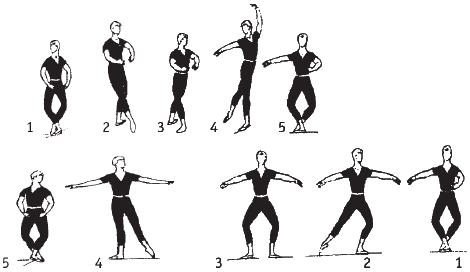 Упражнения на середине. Разучивание пор де бра I–II форма. Задачи: развитие координации, пластики движений, точная фиксация поз, совершенствование осанки. Разучивание тан лие (temps lie) в положение на носок. Temps lie – упражнение, развивающее слитность перехода из одной позы в другую приемом pas degage (дегаже). Подразделяется на три вида. В первом фиксируются позы партер, в положение на носок, во втором – позы на 45° в положение книзу, в третьем – позы на 90° (т. е. вперед и выше). Temps lie par terre. Исходное положение – V позиция, правая впереди, в полповорота направо. Выполняется demi-plie, затем правая нога скользящим движением отводится вперед, на носок, левая остается в demi-plie. Далее выполняется pas degage вперед через проходящее demi-plie, левая отводится назад на носок и приставляется в V-ю позицию назад в demi-plie. Руки во время отведения правой ноги вперед на носок из подготовительной позиции поднимаются в I-ю позицию. При выполнении pas degage левая рука поднимается в III-ю позицию, правая отводится во II-ю. При возвращении ноги в V-ю позицию назад левая рука опускается из III-й в I-ю позицию. Центр тяжести туловища во время отведения правой ноги вперед на носок удерживается на левой ноге, при выполнении pas degage центр тяжести туловища переносится на правую ногу.
