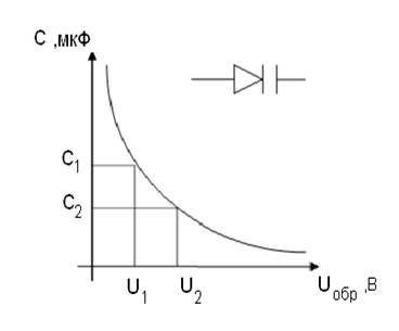 p- n - переход можно рассматривать как конденсатор, обкладками которого является р и n области монокристалла, а диэлектриком - обедненный СНЗ участок между ними (собственно p- n - переход). В кристалле с обеих сторон границы есть 2 слоя разнополярных неподвижных ионов примесей. В p- n - переходе сопротивление R большое, а при обратных напряжениях – очень большое. Ширина перехода - аналог расстояния между обкладками конденсатора. Изменение Uобр изменяет ширину p- n - перехода и величину пространств. заряда и барьерную разность потенциалов ↑d => уменьшается C Эта емкость есть и при прямом включении, и ее значение даже больше. Но при прямом включении R самого перехода (эквивалент диэлектрика) мало.