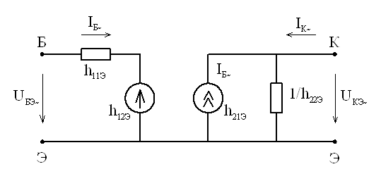 При выводе не оговаривалась схема включения БПТ. В зависимости от схемы включения h-параметры снабжаются индексами: hijЭ, hijБ, hijК. Можно составить схему замещения БПТ в h-параметрах. Для любой схемы замещения структура будет одинаковой, но обозначения электродов, токов, напряжений и параметров hij будут соответствовать схеме включения.