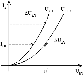 При UКЭ1=0 остается только один p-n переход. При увеличении UКЭобр до UКЭ2 увеличивается ширина коллекторного перехода (т.к. в базе меньше примесей), а следовательно увеличивается сопротивление базы, т.е. уменьшается ток базы IБ. В базе происходит рекомбинация неосновных носителей, которые получаются благодаря инжекции ОНЗ из эмиттера в базу при увеличении Uпр на ЭП. Сопротивление базы увеличивается более резко, чем уменьшается IБЭ. В результате падение напряжения на базе увеличивается и при неизмененном значении UБЭ уменьшается напряжение, прикладываемое непосредственно к эмиттерному переходу. Выходные ВАХ