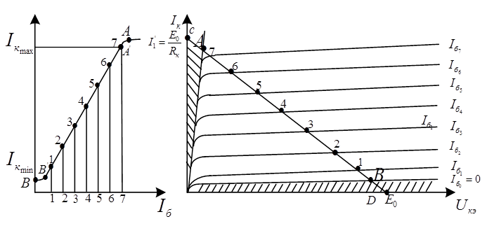 Очевидно нужно выполнить задачу преобразования координат, учитывая, что Rб линейно, его ВАХ будет прямой и для построения нужно знать 2 точки. Координаты этих точек можно получить обрабатывая выражение из 2 з. Кирхгофа нашей цепи. E=IσRσ+Uст; Urδ=IσδRσ Iδ=Icт=I Преобразовать координаты- выразить координату Urδ через значение Uст. I=E-Uст/Rσ