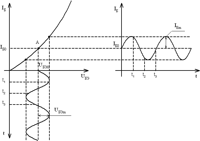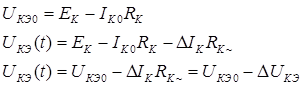 Видно, что при опускании ИРТ преобразования становятся нелинейными. Iко=βIбо, Iк~=h21Iб~ ΔIк~ ΔIб – преобразование К-Б линейно. Iк~ при протекании через Rк~ сознаёт на нем падении напряжений, которое по сути дела является Uн. Uкэ=Eк-Iк0Rк Подадим ΔUкэ.