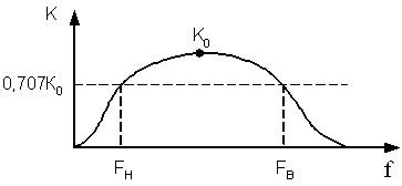 Полоса частот, в пределах которой модуль коэффициента усиления изменяется не более заданной величины, устанавливаемой из практических потребностей, называется полосой пропускания усилителя. Граничные частоты полосы пропускания называются нижней и верхней частотой полосы пропускания. Если не указывается допустимое изменение K, то допускается, что K=0,707K0, что соответствует уровню 3 дБ. Анализ работы усилителя проводят с помощью гармонического сигнала, а свойства усилителя определяют по его частотным характеристикам. Если в пределах полосы частот источника сигнала усилитель имеет разный коэффициент усиления, то это приводит к частотным искажениям сигнала. Частотные искажения сигнала – это искажения закона изменения выходного тока от напряжения по сравнению с законом изменения ЭДС источника сигнала от времени. Они возникают благодаря наличию реактивности в усилителе (разделительных емкостей, трансформаторов, индуктивностей, паразитных C и L). Наличие разделительных емкостей является причиной частотных искажений на низких частотах. Частотные искажения – линейные, т.к. возникают в линейной цепи.