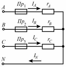 176. Электрической цепь на рисунке имеет rB=rC=2rA. как изменятся токи, если перегорит предохранитель Пp1. 1) IB не изменится. +2) IN увеличится. 3) IC не изменится. 4) IА изменится 177.Почему обрыв нейтрального провода в четырехпроводной трехфазной системе является аварийным режимом? 1) Увеличится Uна всех фазах приемника, соединенного треугольником. 2) На одних фазах приемника, соединенного треугольником, Uувеличится, на других уменьшится. +3) На одних фазах приемника, соединенного звездой, Uувеличится, на других уменьшится. 4) На всех фазах приемника, соединенного звездой, U возрастет.