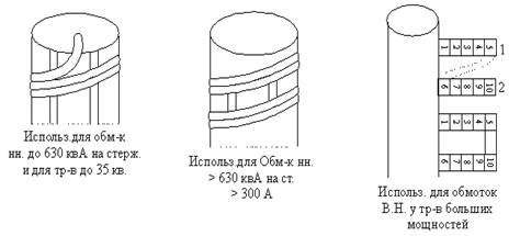 Марка стали (пример). Первая цифра – по структурному состоянию и прокату 1. горячекатаная изотропная 2. холоднокатаная изотропная 3. холоднокатаная анизотропная с ребровой структурой. Вторая цифра – содержание кремния 1. до 0,8 % 2. 1,8 – 2,8 % 3. 2,8 – 3,8 % 4. 3,8 – 4,8 % Третья цифра – характеризует удельные потери 1. нормальные потери 2. низкие потери 3. пониженные потери Четвертая цифра – порядковый номер типа стали. 2. Обмотки а) дисковые у броневого трансформатора б) цилиндрические в) винтовые г) непрерывные Однослойные и многослойные