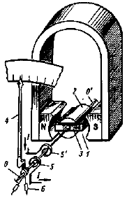 Принцип действия магнитоэлектрических приборов основан на взаимодействии магнитного поля постоянного магнита и обмотки с током. В воздушном зазоре 1 (рис. 31) между неподвижным стальным цилиндром 2 и полюсными наконечниками NS неподвижного постоянного магнита расположена алюминиевая рамка с обмоткой 3, состоящей из ω витков изолированной проволоки.