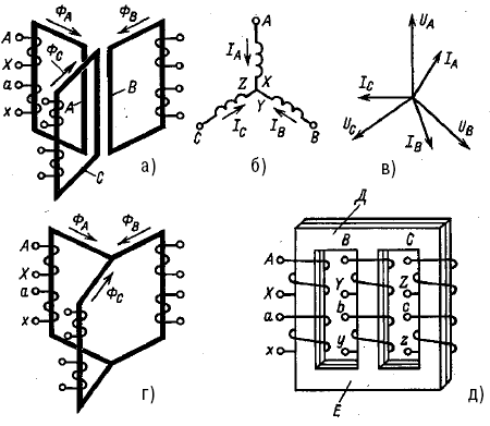 Рис. 40. Трехфазный трансформатор Трехфазный трансформатор состоит из трех однофазных, магнитопроводы которых объединены в один общий трехстержневой (рис. 40д). Действительно, если три однофазных двухобмоточных трансформатора расположить, как изображено на рисунке 40а, а их первичные обмотки соединить звездой (рис. 40б) и подключить к трехфазной сети, то в них возникнут токи холостого хода. Токи будут иметь одинаковое значение, но будут сдвинуты друг относительно друга на 120° (рис. 40в). Магнитные потоки, создаваемые токами, также будут сдвинуты на 120°. Сумма магнитных потоков, так же как и токов, будет равна нулю. Если объединить три стержня АВС однофазных трансформаторов в один, то в этом стержне магнитного потока не будет, и надобность в нем отпадает. В результате образуется трехфазный трансформатор (рис. 40г). Но изготовление такого трансформатора технически и технологически затруднено. Действительно, гораздо удобнее расположить стержни магнитопровода в одной плоскости, как изображено на рисунке 40д. По сути дела, ничего не изменится. Но при этом немного уменьшится длина магнитопровода для среднего стержня В. Это несколько нарушит симметрию магнитопровода трансформатора и приведет к тому, что намагничивающий ток (ток холостого хода) обмотки среднего стержня В будет несколько меньше, чем ток обмоток стержней А и С, но асимметрия не имеет практического значения. Итак, трехфазный двухобмоточный трансформатор (рис. 40д) имеет один трехстержневой магнитопровод с двумя обмотками на каждом из стержней. Каждая фаза трехстержневого трансформатора представляет собой по существу однофазный трансформатор. Поэтому анализ работы и расчет трехфазных трансформаторов при равномерной нагрузке каждой фазы аналогичны однофазным и схема замещения изображается для одной фазы. Начала и концы первичных обмоток обозначаются большими буквами – соответственно, AX, BY, CZ, вторичных обмоток – малыми буквами ax, by, cz. Фазы вторичных обмоток, так же как и первичных, могут быть соединены звездой или треугольником.
