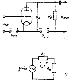 Рис. 77. Однокаскадный усилитель: а) принципиальная схема; б) схема замещения В геофизической аппаратуре такие электронные устройства, как усилители, имеют наибольшее распространение. На сейсмостанциях они используются для усиления сейсмоколебаний. Усилители играют важную роль в электронных схемах аппаратуры радиоактивной разведки, в полевых станциях электроразведки, измерительной аппаратуре, осциллографах и т. п. Усилитель может содержать один или несколько усилительных каскадов. Усилительный каскад состоит из усилительной лампы или полупроводникового триода и непосредственно присоединенных к ним других элементов схемы (сопротивлений, конденсаторов, трансформаторов и т. п.). В схеме простейшего однокаскадного лампового усилителя (рис. 77) в качестве анодной нагрузки включено активное сопротивление Ra. Подлежащее усилению напряжение Uвх подводится к сеточной цепи лампы. При отсутствии I в анодной цепи лампы протекает постоянный ток Ia0, величина которого определяется анодным напряжением и постоянным напряжением сеточного смещения Uc0. Появление переменного напряжения UвхUc0 с амплитудой Uc1 вызывает изменение анодного тока, в котором появляется переменная составляющая с амплитудой Ia1. На зажимах сопротивления Ra создается напряжение, содержащее постоянную составляющую Ia0Ra и переменную Ia1Ra. Последняя может быть значительно больше, чем амплитуда Uвх напряжения, поданного на вход усилителя. Путем включения конденсатора, пропускающего только переменный ток, но не пропускающего постоянный ток, можно выделить переменное напряжение с амплитудой U = Ia1Ra, которое и представляет собой усиленное напряжение Uвых на выходе усилителя.