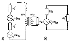 Рис. 81. Схемы замещения двухтактного каскада: а) последовательная; б) преобразованная Двухтактный усилитель мощности с симметричными плечами схемы может быть представлен схемой замещения, показанной на рисунке 81а. Здесь каждая лампа заменена генератором с эквивалентной ЭДС = µUc1 и внутренним сопротивлением R′i, где R′i представляет собой приведенное внутреннее сопротивление лампы, определяемое с учетом того, что переменная составляющая анодного тока протекает лишь в течение части периода. В частности, в режиме класса А R′i = Ri, а в режиме класса В R′i = 2Ri. Электродвижущая сила, равная 2µ Uc1, действует в последовательной цепи, содержащей внутренние сопротивления эквивалентных генераторов 2R′i и сопротивление нагрузки R′a = Rн / k2 (рис. 81б).