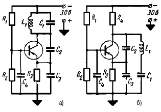 Рис. 85. Схемы генераторов на полупроводниковых триодах: а) с параллельным контуром; б) с последовательным контуром