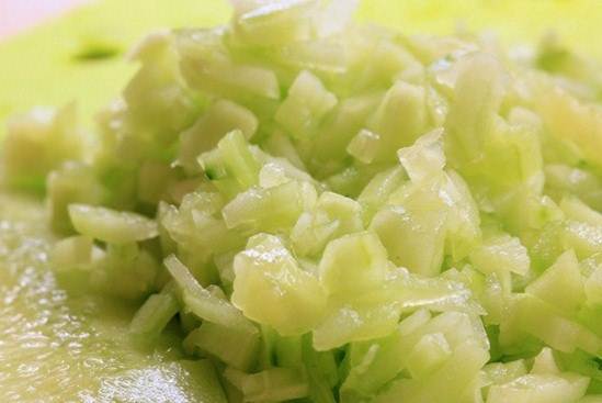 Огурец очищаем от шкурки, режем как можно мельче, также режем помидор.