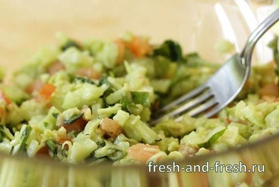 Это лучше сделать сразу перед подачей на стол, чтоб авокадо не потемнело. Если делаете заренее, то сбрызните его слегка соком лайма или лимона.