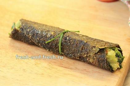 Сыроедческие блинчики не содержат свернувшихся белков и муки, поэтому они не могут долго так хорошо держать форму, если лежат уже с сочной начинкой - живые продукты быстро пропитываются свежим соком и будут уже не такими красивыми. Поэтому начинку кладем только перед самой подачей на стол! Кстати, без начинки они неплохо хранятся в холодильнике минимум два дня, сохраняя такую же структуру и не пересыхая. (только не надо плотно накрывать, достаточно положить салфетку).