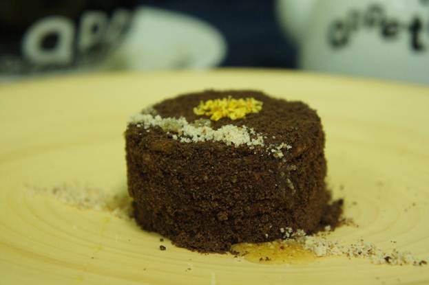 Далее, выкладываем половину получившейся массы в формочку и сверху кладем слой тонко нарезанных бананов (10г). Затем, половину оставшейся основы, кладем сверху бананового слоя. Затем кладем нарезанный мелкими кусочками лайм и сверху лайма вновь кладем бананы (10г). Сверху укладываем оставшуюся массу основы. Сверху посыпаем все крошкой сыроедного шоколада или тертыми какао бобами. Украшаем цветками Гуихуа и миндальной крошкой.