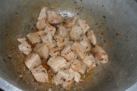 Для этлого супа я все продукты режу довольно крупно. Берем мясо и обжариваем его со специями и солью (у меня есть волшебный казанок)