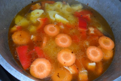 когда мясо будет готово, добавляем воды, овощи, а именно: картофель, морковь, болгарский перец и помидоры