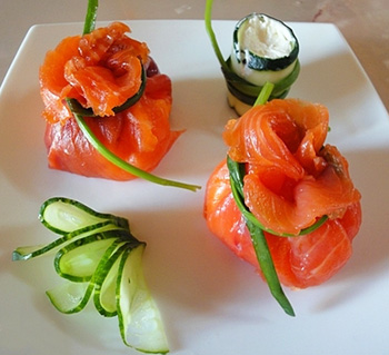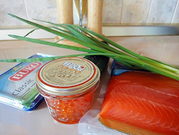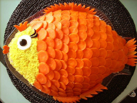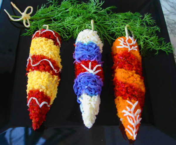 Для украшения, показанного на фото, используем тертый яичный желток, ломтики отварной моркови, яичный белок и черные оливки.