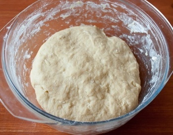Добавляем 3/4 от нормы муки и перемешиваем до однородности. Постепенно добавляя оставшуюся муку, замешиваем однородное мягкое тесто. Оно будет немного липнуть к рукам - ничего страшного, просто в конце работы с тестом смажьте руки растительным маслом. Накрываем тесто пищевой пленкой и оставляем в теплом месте подходить. У меня это заняло всего минут 30, но в зависимости от разных условий может растянуться на час и больше.