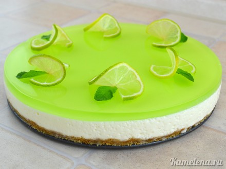 Ингредиенты: 200 г печенья (типа юбилейного); 100 г масла; 500 г сметаны; 150 г сливочного сыра (Альметте, Филадельфия, Маскропоне); 120 г сахара; 1 пакетик ванильного сахара (10 г); 1 пакетик желатина (10 г); 1 пакет желе зеленого цвета (киви); 1 лайм (можно заменить лимоном); 1 веточка мяты (не обязательно).