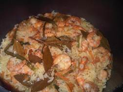 Лук мелко порезать, морковь натереть на крупной терке, обжарить на режиме «Выпечка». Добавить рис, креветки, помидоры, залить водой, поставить на режим «Плов».