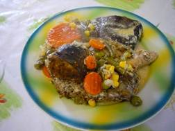 На режиме «Выпечка» растопить масло и немного пожарить в нём нашинкованный лук. Добавить 300 мл. воды и сметану. Закрыть и мин. 5 оставить на «Выпечке». Выключить «Выпечку», положить туда овощи и рыбу, нарезанную кусочками средней величины. Режим «Тушение» на 1 час.
