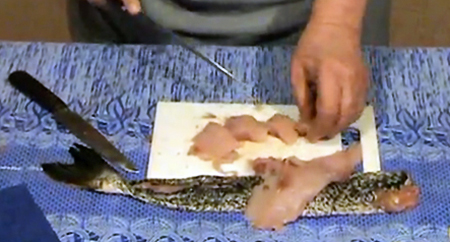 9. Кусочки филе разрезаем на несколько частей, чтобы потом пропустить их через мясорубку.