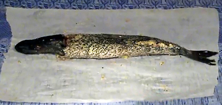 14. Формируем наполненную фаршем кожу так, чтобы она напоминала рыбу.