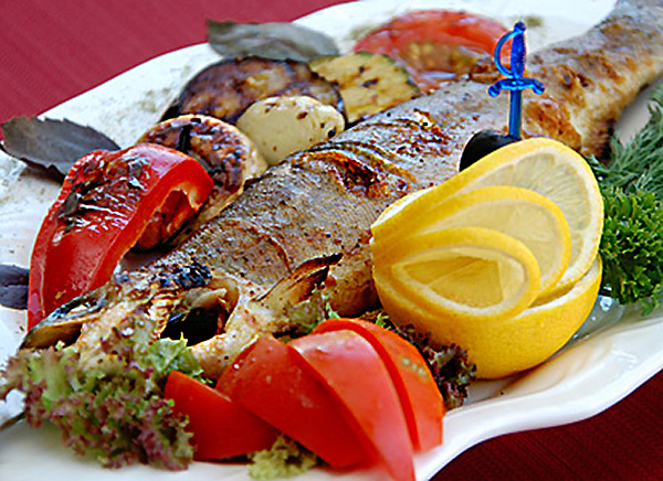 Щука постная, фаршированная по-свято-троицки с украшением овощами.