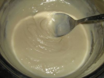 Влить, помешивая, молоко. Размешать до получения гладкой массы без комочков.