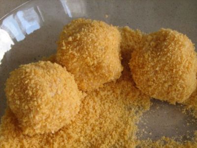 Обвалять крокеты попоследовательно в муке, яйцах и панировочных сухарях.