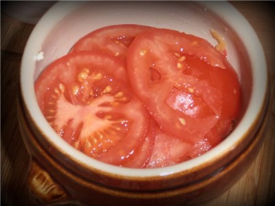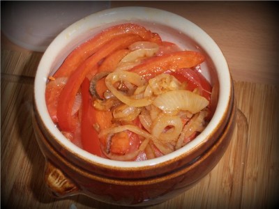 . Паприку нарезать тонкими полосками затем разделить на две части. Одну половину добавить к луку. Томат нарезать кружочками. Горшочки смазать маслом положить в них брынзу затем половину лука с жареным перцем,затем томат